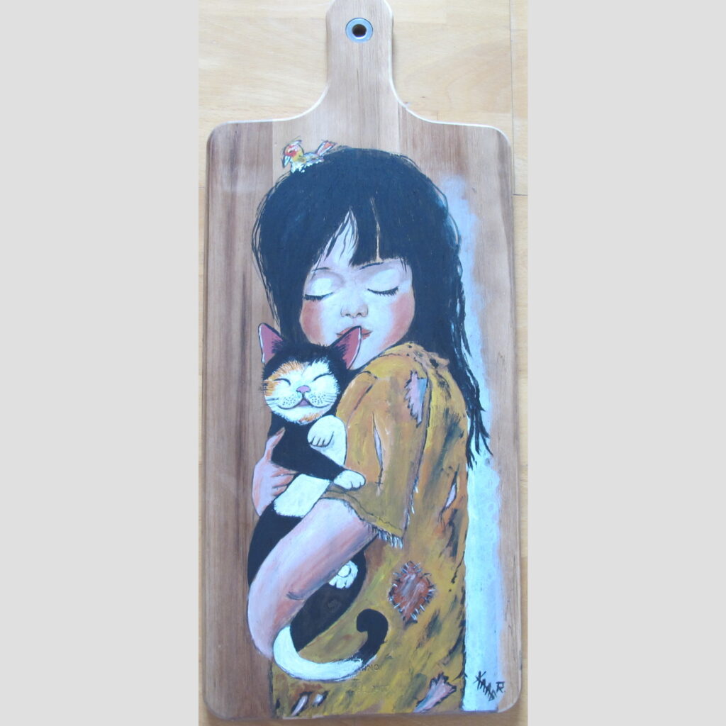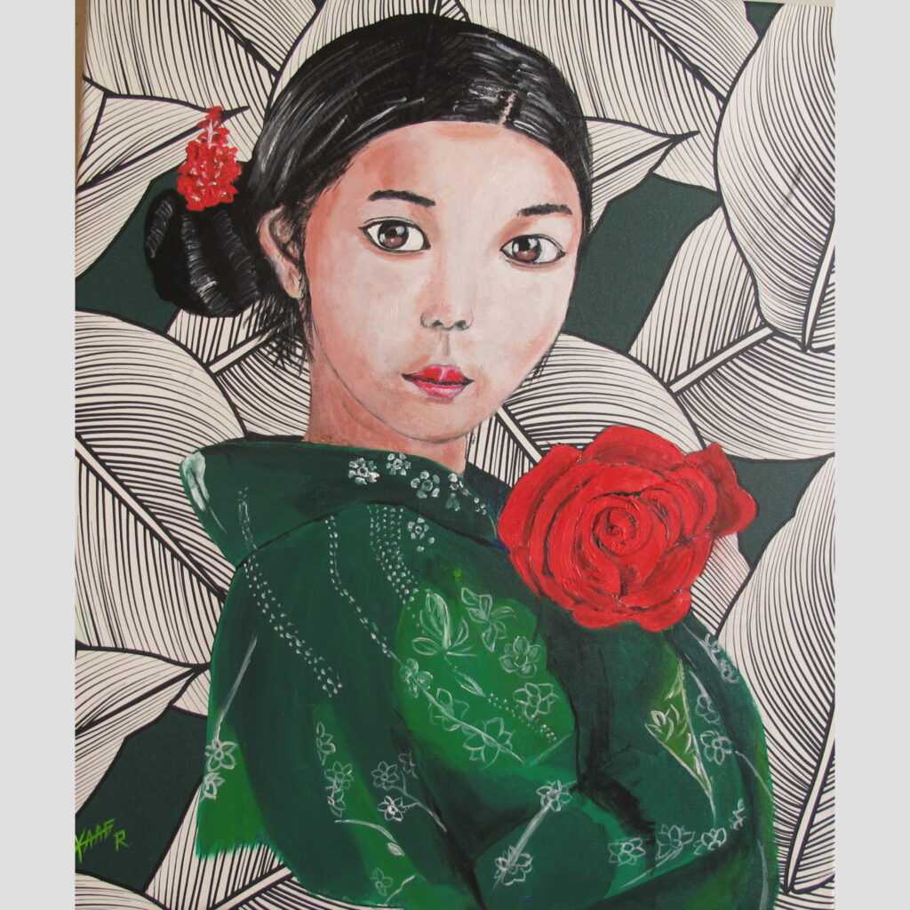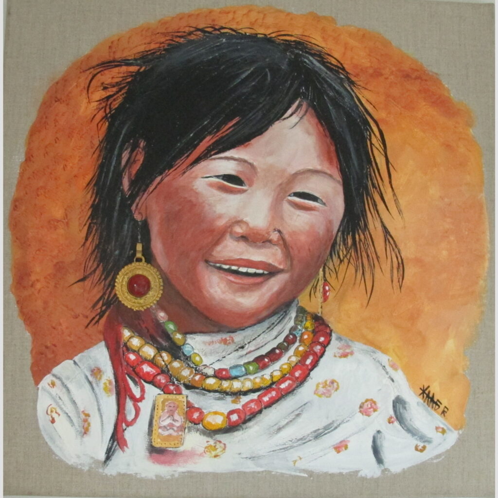 Mes tableaux sont inspirés par des voyages au Népal, visages d’enfants, paysages. J’aime aussi peindre des fleurs et des femmes, je me suis intéressé aux animaux durant le confinement. Je travaille avec de l’acrylique et des pigments sur toiles et bois.